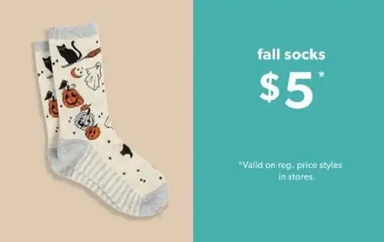 Hurry! Shop in store and get fall socks now for only $5.