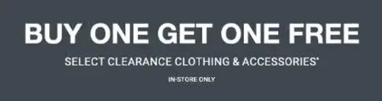Don't miss out! Shop in store and get buy one, get one free on select clearance clothing & accessories.