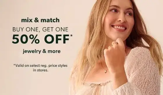 Don't wait! Shop in store and enjoy buy one, get one 50% off jewelry & more.